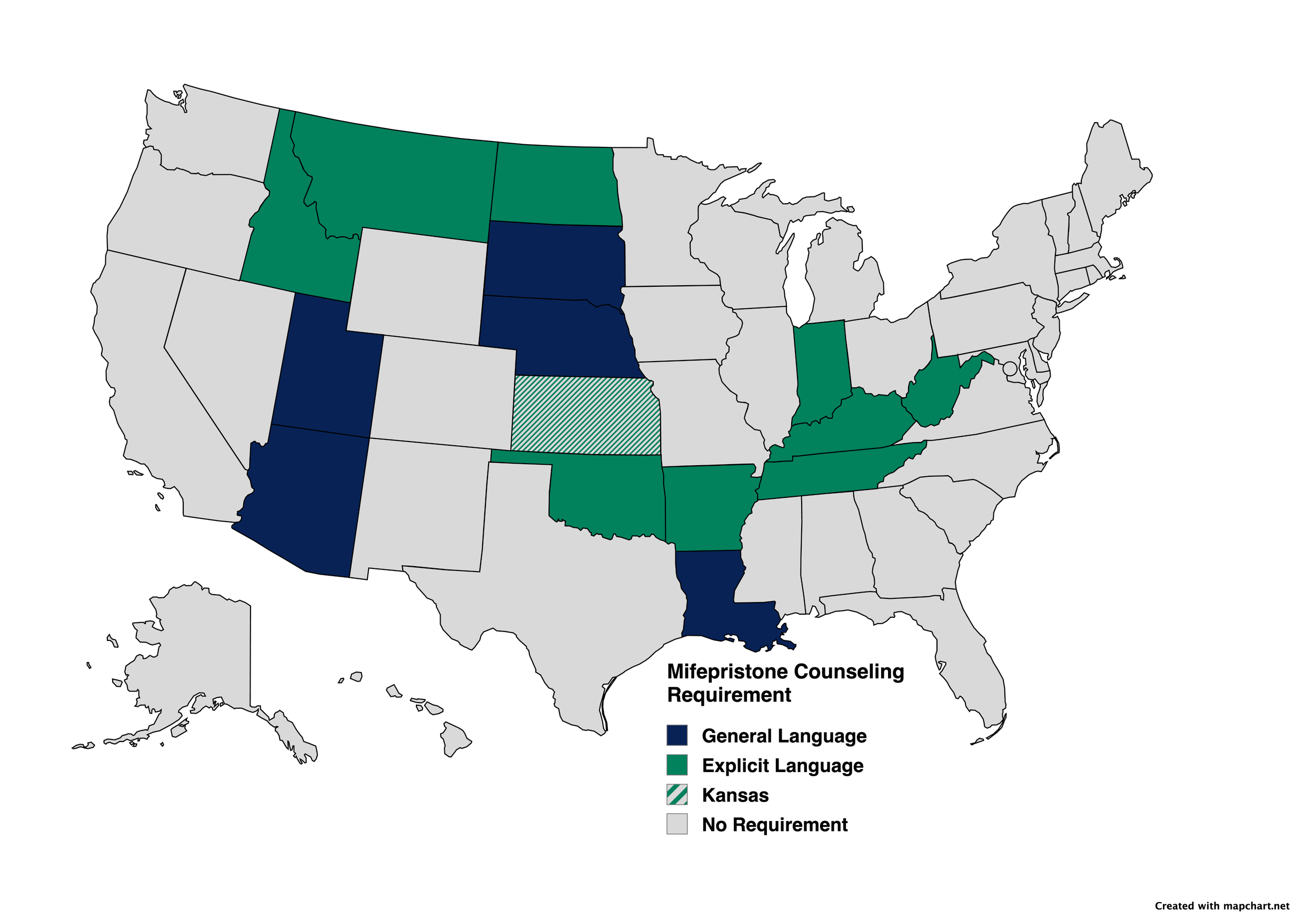 State mifepristone counseling requirements as of 2021. Kansas legislation requiring explicit language was ruled unconstitutional, leaving current policy unclear.
