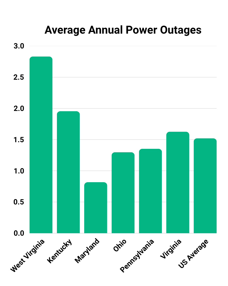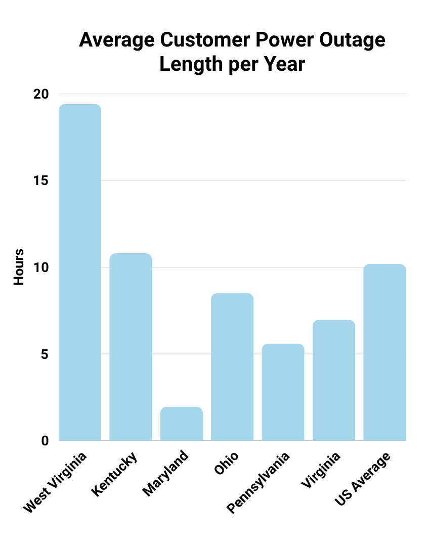 The average West Virginian will lose electricity at least twice per year, for a total of nearly 20 hours. Adapted from Electric Power Annual.