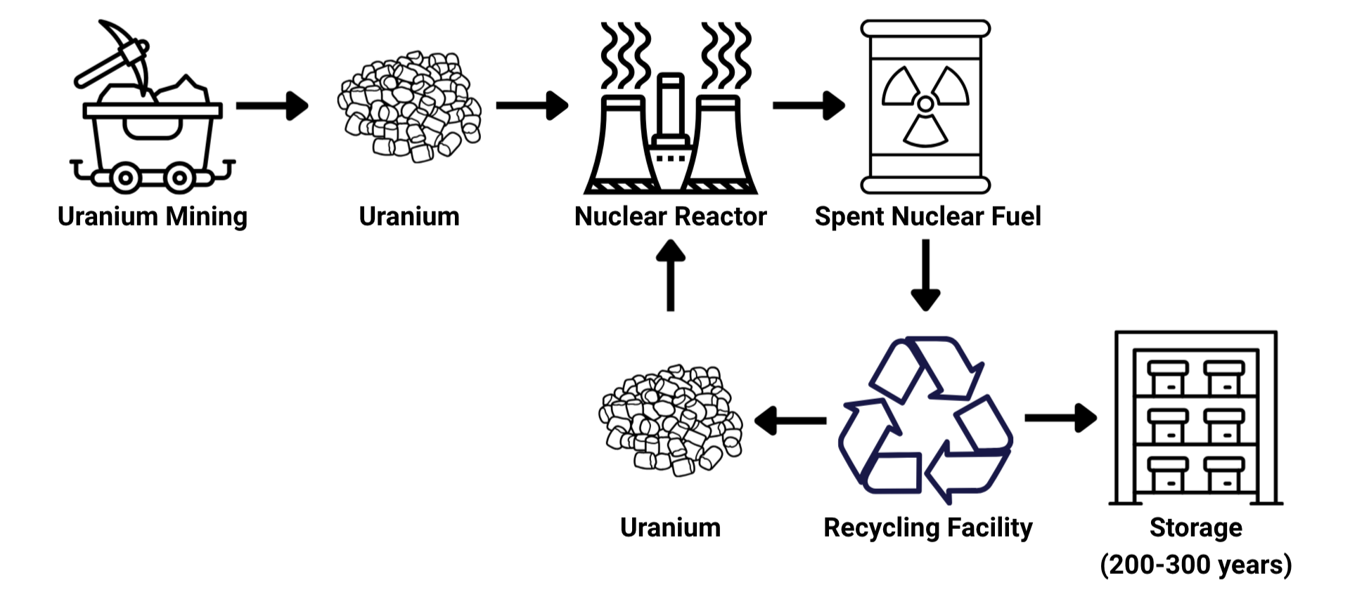One option to help circumvent the increasing amount of SNF in the US and its need for long term storage is to recycle the SNF. SNF recycling would allow more energy to be harnessed from the uranium used in the reactors. The current reactors in the US use less than 5% of the energy contained in uranium. This is because byproducts from the nuclear energy generation process act like a sponge and absorb the molecules needed to maintain the reaction. When enough of these byproducts build up, the nuclear reaction is not able to be sustained and ends before all of the energy can be used.
