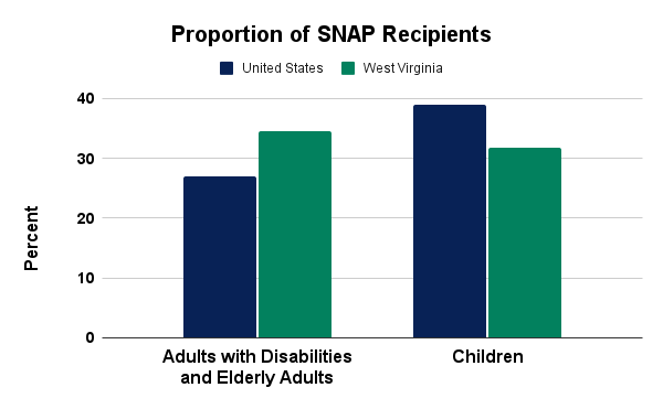 About 1 in every 6 adults and 1 in every 5 children faces hunger in West Virginia. Of all recipients, adults with disabilities and elderly adults make up a higher proportion of SNAP recipients and children make up a lower proportion in West Virginia than the US. In order to be eligible for SNAP in West Virginia, a household’s net income must be below the federal poverty level ($2679/month for a 4 person household). In fiscal year (FY) 2022, the most recent data available, 14.4% of West Virginians were SNAP-eligible compared to 11.6% nationally.